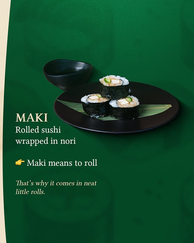 Specifically, the word maki means “to roll”, which is exactly what it is: rice and fillings rolled up in nori (seaweed) and sliced into neat pieces. Simple, classic, and easy to recognise.